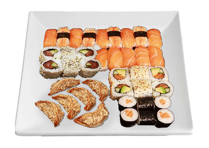8 Sushi saumon + 4 Sushi crevette + 6 Maki saumon + 6 California thon avocat concombre + 6 California saumon avocat concombre + 6 Gyoza.